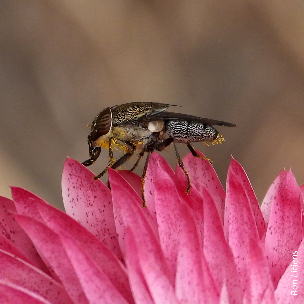 Like bees, some flies are also good pollinators of plants and consume nectar from a range of flowers. They also have mouth parts adapted for different shaped flowers. Under the category of blowflies is a genus of fly called Stomorhina (from the Greek stoma meaning mouth and rhino meaning nose). They are commonly called Snout Flies or Nose Flies (pictured above) because of their long probosces.
