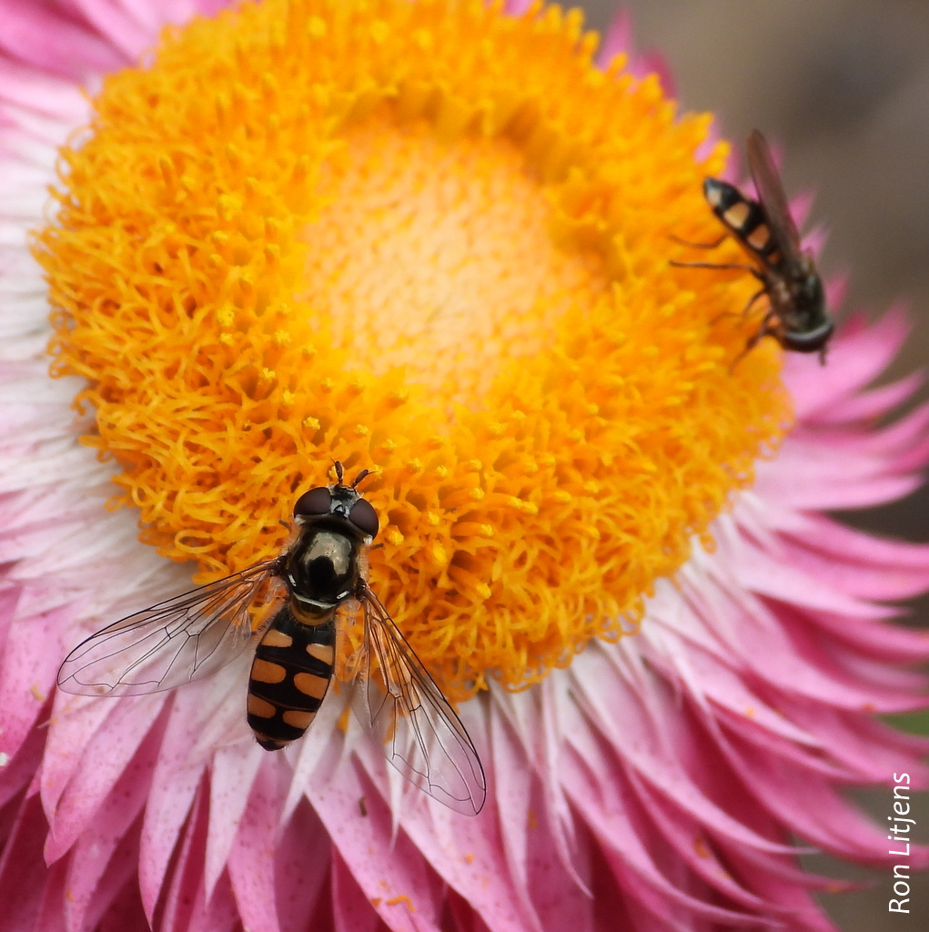 Flowering plants first occurred in the fossil record about 100 million years ago, at the same time that bees appeared. Theory says that the two co-evolved i.e. bees responding to changes in the flowers and vice versa. Today flowers come in all different shapes ranging from flat daisy-like flowers to tubular-like flowers of heath and correa. It is not surprising therefore that the insects that visit them have different adaptions to access the nectar and pollen.