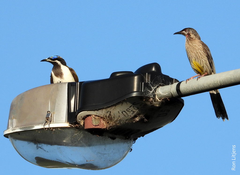 The photo below (entitled ‘The Big Two out of Five’) is of an equivalent meeting but for honeyeaters. The meeting was held on a street lamp in Yea, Victoria. It features a Blue-faced Honeyeater (Entomyzon cyanotis) on the left and a Red Wattlebird (Anthochaera carunculata) on the right. The latter is the second largest of the Australian honeyeaters and the BFH sits in the top five in terms of size. The largest Australia honeyeater, the Yellow Wattlebird (Anthochaera paradoxa) is endemic to Tasmania and could not make the flight across Bass Strait for the conference.