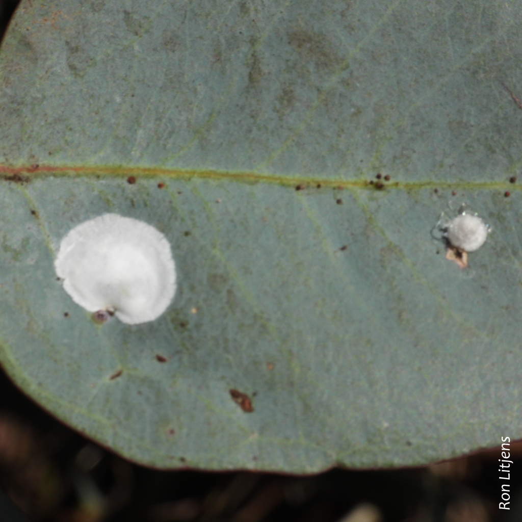 Psyllids are small ‘cicada-looking’ insects that suck sap out of leaves (Click HERE for more info). When psyllid eggs hatch the nymphs also suck sap. As they do they extrude a sugar/wax type substance known as honeydew. They fashion this substance into protective houses under which they live. The houses are known as lerps and different psyllid species construct different shaped lerps. Pictured left are the White Clam lerp (Hyalinaspis sp.), left and the Sugar lerp (Glycaspis sp.), right. Lerps offer the nymph a humidity-controlled environment and shelter from predators. And there are many of those.