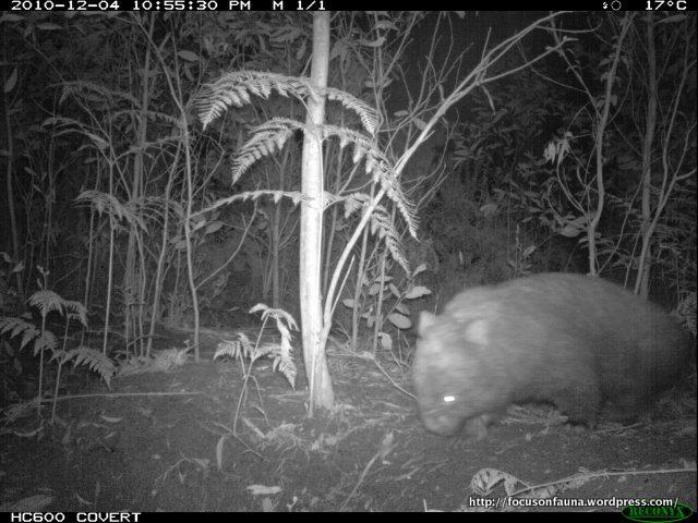 A Common Wombat moves through its territory and triggers the remote camera into action. Among ground-dwelling animals wombats probably survived the fires better than most. Having deep, often extensive burrows, they could at least escape the flames and heat of the fires, though that may not have been enough to save them.