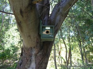 Nest boxes are certainly proving popular for Sugar Gliders in Flowerdale since the 2009 fires. And they are not fussy about the design. This small box at the Three Sisters was intended for pardalotes, but is now home to a Sugar Glider. It appears from the chewed area around the entrance that a rosella has investigated the box as a potential nesting site.