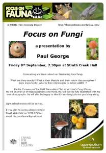 Focus on Fauna is holding another evening information session, this time on fungi, with Paul George from the Fungi Group of the Field Naturalists Club of Victoria. So why not join us at the recently renovated Strath Creek Hall on 9th September?