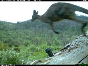 Over the course of a week, one of our remote cameras recorded around 1700 images showing the daily activities of a mob of Eastern Grey Kangaroos (Macropus giganteus) on a Flowerdale property off Moores Road. The site was obviously a regular haunt of the kangaroos, and the fallen tree where our plastic scent-lure was attached was right across their well-used trail.