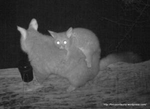 Two remote cameras set up on a steep burnt slope on a property just west of Strath Creek captured hundreds of night-time images of a family group of Common Brushtail Possums (Trichosurus vulpecula). The video clip below shows the female possum with her young riding on her back. It is noticeable from the lack of eyeshine that the mother has a damaged left eye.