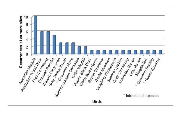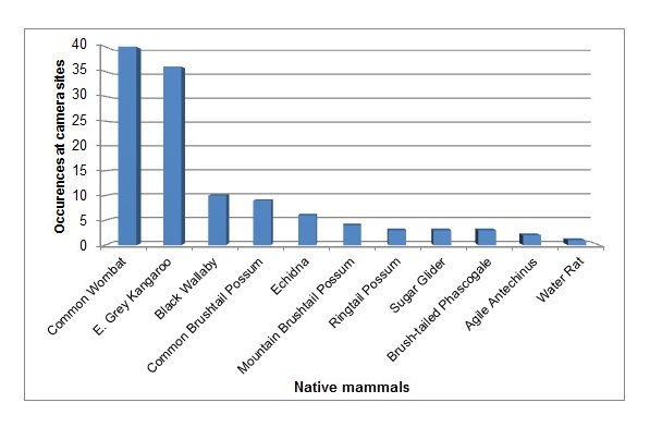 An analysis of our remote camera survey results over the period January to November shows that wombats and kangaroos were by far the most frequently recorded native animals. From almost 100 camera deployments (each for a period of one week) on 25 properties, we recorded 11 native mammal species, 9 introduced mammals, 21 bird species and one reptile (a Common Blue-tongue).