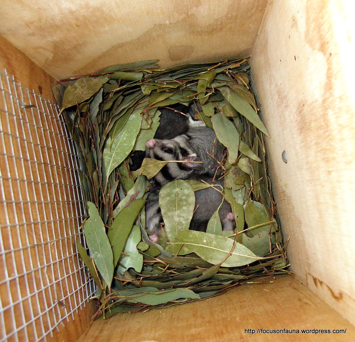 As a follow-up to the previous post, here’s another nest-box installed as part of the fire-recovery project. We noticed signs of gnawing around the entrance hole and thought we should check inside it, even though it had only been installed fairly recently. Sure enough, inside was a huddle of Sugar Gliders (Petaurus breviceps) snuggled into a nest of eucalyptus leaves – what better way to spend a cold, foggy day in Strath Creek?!