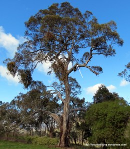 We first heard this Striated Pardalote calling somewhere in a large Yellow Box tree in our front garden. Upon investigation, we saw it popping in and out of a hole at the end of a cut branch (see arrow on photo at left).