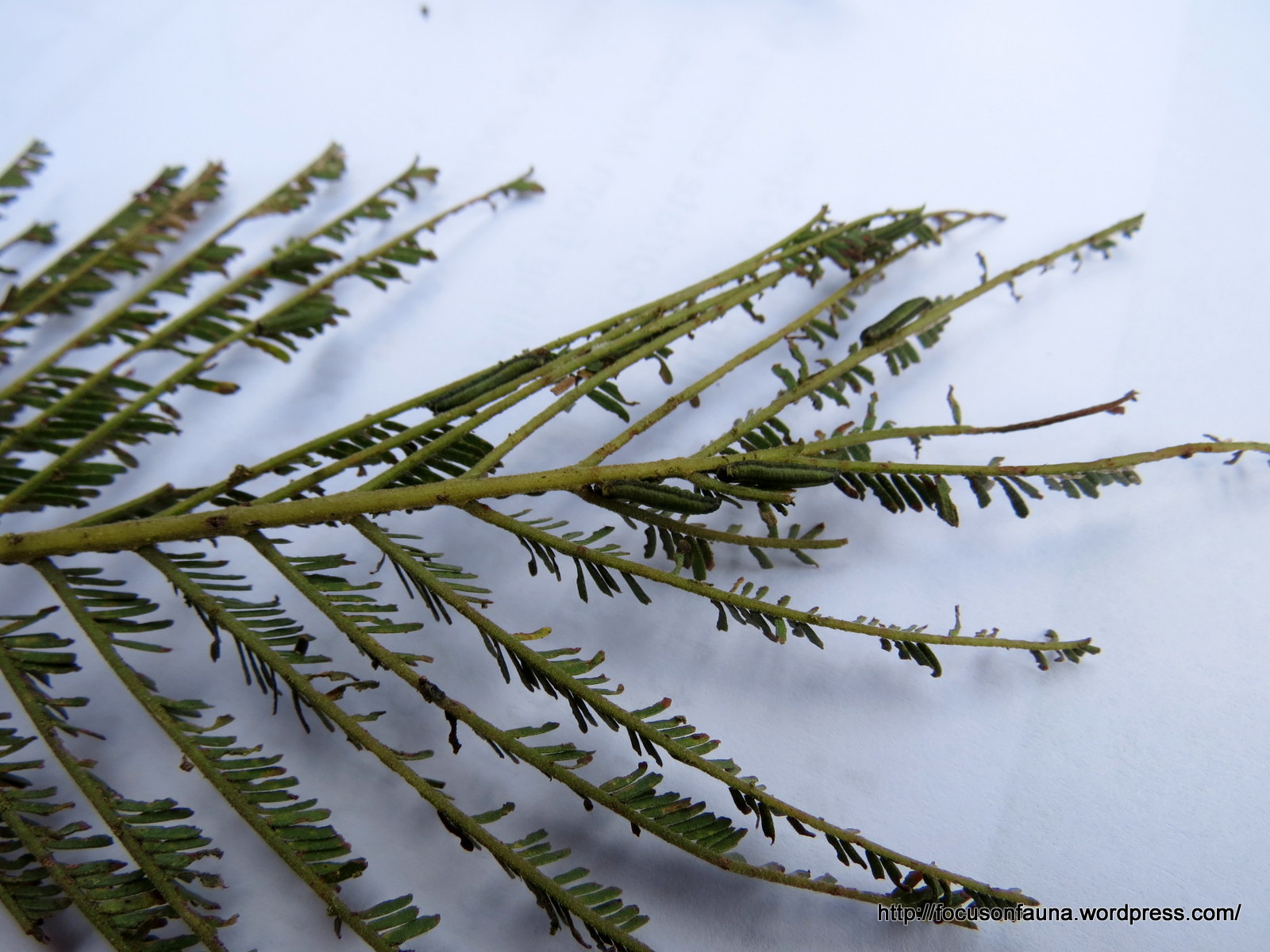 The wattle species affected are those with feathery bipinnate foliage: Silver Wattle (Acacia dealbata) and Black Wattle (Acacia mearnsii). The culprit is what appears to be a small caterpillar, as seen in the photo at right (click on it for a closer look).
