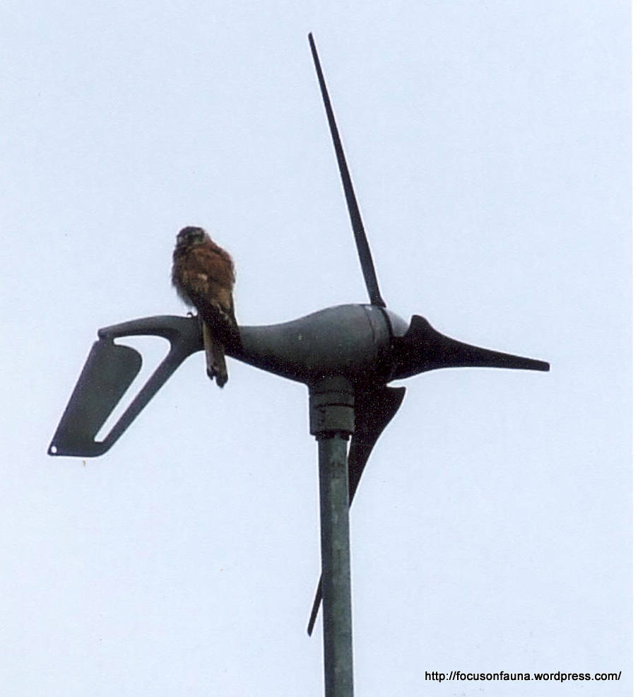 Another unidentified bird can also be seen on the turbine in the less-than-clear photo below. Any ideas on what it may be? We’re guessing a smaller raptor, perhaps a hobby or kestrel.