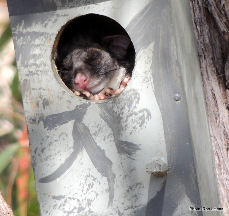 Even before Chubster had left, prospective tenants, in this case two Common Ringtail Possums (Pseudocheirus peregrinus), were lining up to view the property. And sure enough, last week we noticed that the new tenants had moved in – both of them together. This behaviour is not unusual as these possums commonly live in a communal nest called a drey. Although much smaller than Chubster, in the recent hot weather we have observed these ringies hanging various bits of themselves out of the nest box entrance, or just catching a breath of fresh air.