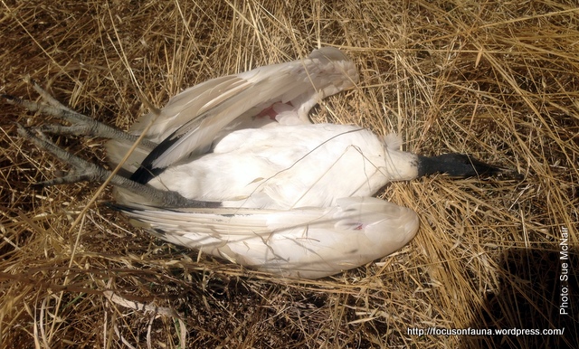 It was a particularly hot day, so another possible cause of death of Sue’s Australian White Ibis might be heat-stress or dehydration. Hopefully it wasn’t a duck shooter with poor identification skills! We have occasionally wondered why, with the very large number of birds that must die of natural causes each year, even those of us who are regularly out and about see so few carcasses on the ground, and certainly witnessing the result of a mid-air death, as Sue did, would be a rare event. Consumption of dead birds by scavengers large and small can of course be swift, especially with small birds, but it is perhaps surprising that we don’t come across more remains of larger birds such as ibis.