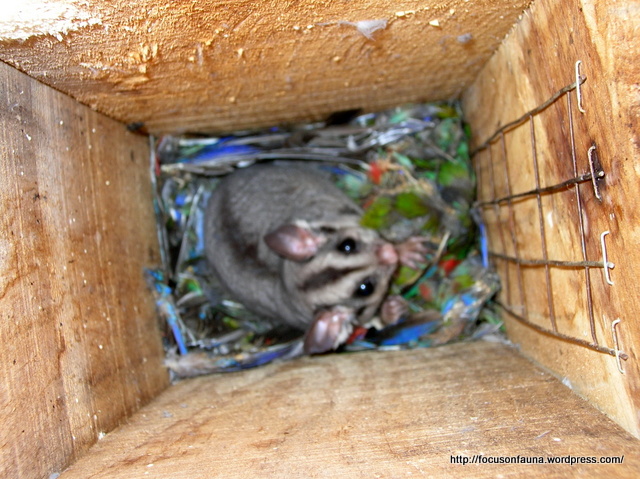Sugar Glider and remains of former rosella occupant – who needs leaves?