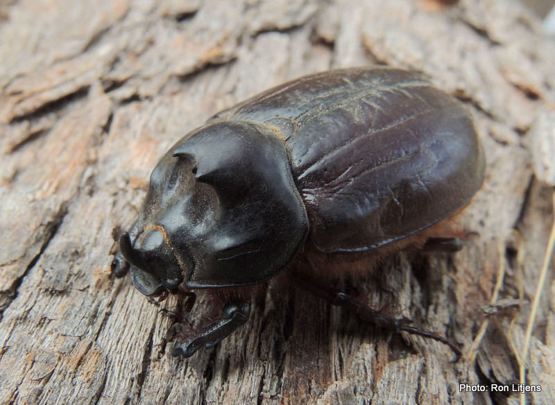 This was evident when I was riding my bicycle recently and was hit in the helmet by a Rhinoceros Beetle (Dasygnathus trituberculatus), (pictured above), a member of the Black Scarab family. At over 3 cm long it is not the biggest beetle around, but it is large enough to give you a loud thump on the head. The male beetles have a single horn on the front and two forward-facing horns on the thorax. The horns are used for digging and for fighting other males during the mating season. These beetles, gram-for-gram, are some of the strongest animals on earth in terms of load-carrying ability.