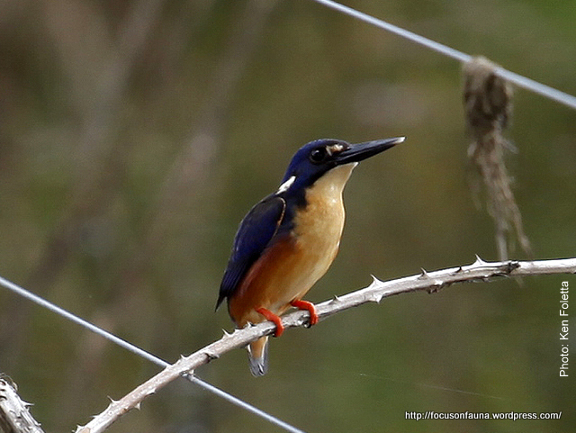 Ken also sent in a picture of the slightly larger and more common Sacred Kingfisher (at right). It isn’t confined to waterways, and may be seen in open woodland where it feeds mainly on small reptiles and insects. Its plumage can be variable which may be confusing for identification. Its distinctive repetitious call is often the first indication of its presence. It also has other less easily identified calls, which can be heard by clicking on the audio bar arrowhead below.