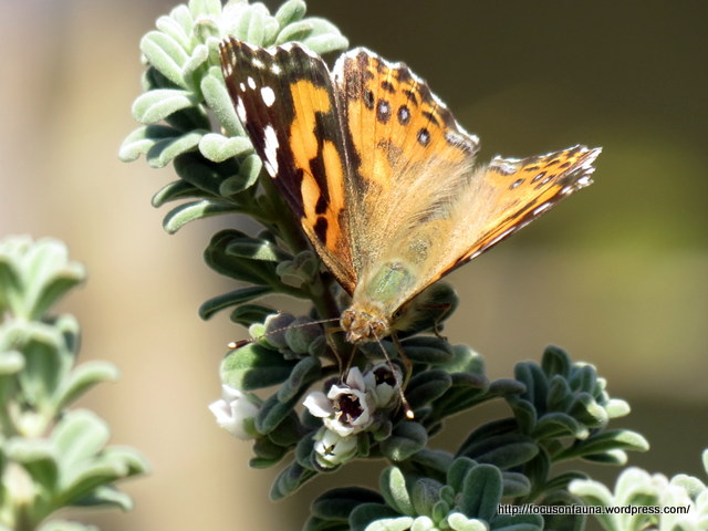 One of the first butterflies to appear in spring is the Australian Painted Lady (Vanessa kershawi) pictured at right, which has taken a particular fancy to a Downy Zieria bush (Zieria cytisoides). For another impressive image of the lady go to the Strathbogie Ranges – Natureview website.
