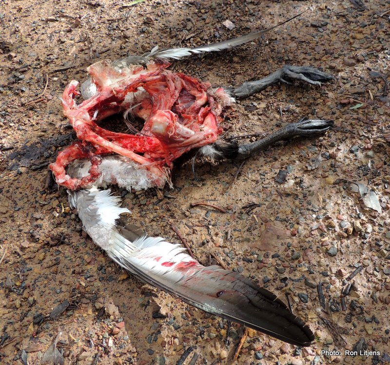 Our pleasant walk was disturbed by finding an eviscerated carcass of what looked to be duck lying in the middle of the driveway. The only recognisable parts were the webbed feet. Whatever animal did the deed did a very good job. The skeleton was mostly intact but there was scarcely any meat left on it. This suggested to us that this wasn’t a fox or feral cat kill.