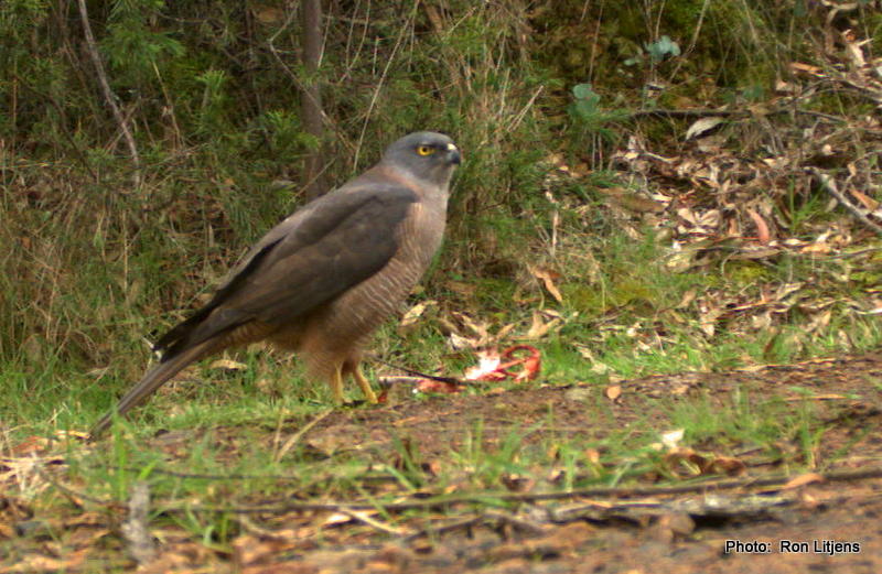 It is hard to know if the bird pictured killed the prey or was just an opportunistic scavenger. Brown Goshawks normally hunt by diving on prey from low, concealed perches using speed and surprise as an advantage. Rabbits and mice make up most of the diet, which can also include birds up to the size of domestic chooks. Brown Goshawks will also feed on carrion. The kill is taken and eaten on a nearby perch. I presume that is where the Goshawk is taking its prize captured in the ‘action shot’ on our camera.