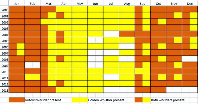One of the advantages of keeping monthly bird records is that you can compare the presence of birds from year to year and the arrivals and departures of migratory birds. The chart below shows that for much of the year the Rufous Whistler tends not to co-exist here with the other local whistler – the Golden Whistler. Another interesting observation from the chart is that February 2009, when the Black Saturday fires occurred, was the only February when neither whistler was present.