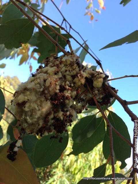 At left is a nest photographed by Andrew on the Three Sisters property between Flowerdale and Strath Creek. The hanging purse-like shape with a side entrance looks to us like a typical Mistletoebird nest. Although usually made of plant down and cobwebs, this one is mostly wool, probably because there was a pile of sheep crutchings close by – a good example of opportunism. The female builds the nest and does all the incubating.