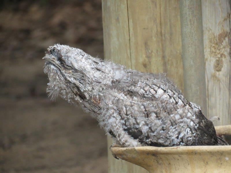 Pictured above is the baby Tawny Frogmouth demonstrating the camouflage pose. Even though the pose is well executed, here is a life lesson for the young bird – if you are going to pretend to be a tree branch, don’t do it sitting in a bird bath. It doesn’t work. We can still see you. Try sitting in a tree.
