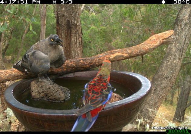 More unusually the larger bird species that never bathe together were seen to throw politeness out the window and participate in a little ‘argy-bargy’ for first use of the water. Pictured left a Grey Currawong (Strepera versicolor) and a young Crimson Rosella (Platycercus elegans) ‘get it on’.