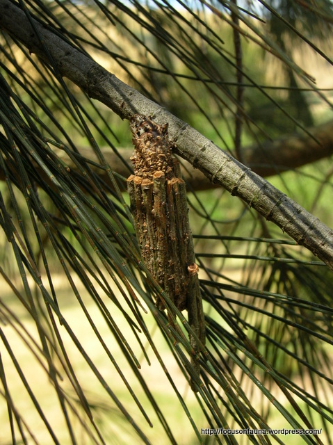 It’s somewhat of a mystery how this cocoon came to be attached to our kitchen window. It belongs to a Faggot Case Moth (Clania ignobilis), which normally feeds on the foliage of species of Eucalyptus, Callitris or Pinus. We didn’t know this at the time and carefully relocated it onto a branch of a nearby sheoak tree, where it seemed well camouflaged, then returned to sit on the veranda with a refreshing drink. A short time later we noticed a Grey Butcherbird fly into the sheoak and out again. We thought we had better check on the case moth – no caterpillar, no case, neither on the branch nor on the ground ! It seems the butcherbird had taken the lot. So our well intentioned relocation did the insect no favours at all !