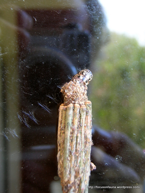 The Faggot Case Moth can be identified by its case having one stick noticeably longer than the rest in its silk and twig construction – faggot meaning “a bundle of sticks bound together”. The larva only extends its thick-skinned head and thorax out of the case to feed and travel, leaving its soft abdomen in the protective case. After pupation the wingless females remain in the case, whereas the males emerge as moths with translucent grey wings spanning about 3cm.