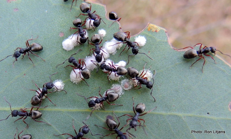 parasites. The larvae exude honeydew which mixes with amino acids to form the crystallised honeydew lerp. As with the recently featured Gumtree Hoppers, which also exude liquid honeydew (click HERE to view), lerps are usually tended by ants (pictured right). In exchange for honeydew the ants offer protection against predators. Given the writing on the information board, I am guessing the ants aren’t very effective against predators such as pardalotes.