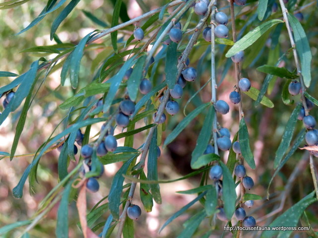 There is no shortage of food for Silvereyes in the reserve. Apart from numerous insects, there are the berries from Tree Violet (Melicytus dentatus) and Prickly Currant Bush (Coprosma quadrifidus) as well as the increasingly prevalent introduced weed Common Elder (Sambucus nigra). Blackberries (Rubus spp.) are present, but in greatly reduced numbers due to ongoing control by Landcare members and the Goulburn Broken Catchment Management Authority.