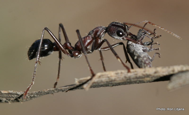 Despite their formidable appearance the adult insect feeds mainly on nectar, seeds, fungi and honeydew excreted by insects such as leaf hoppers and scale insects. The larvae are carnivores. Worker ants are sent out to forage and bring prey back into the nest for them to eat. Sort of like home delivery.