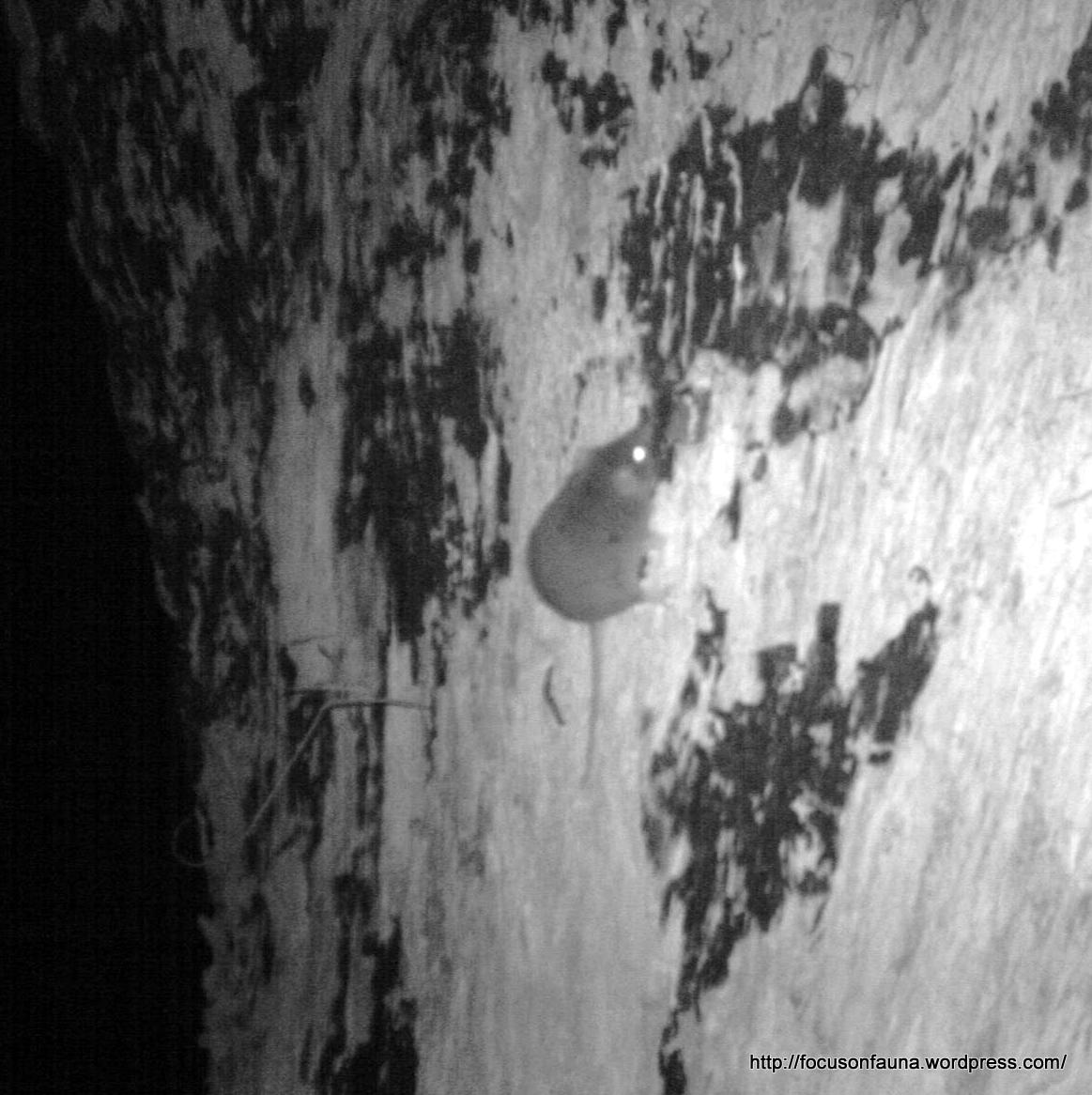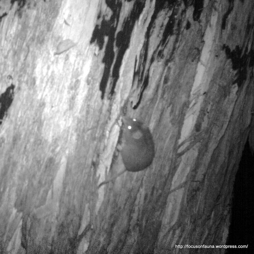 The same remote camera that recorded images of a Grey Currawong featured in our previous post also captured night-time pictures of a small animal darting around the trunk of a Long-leaf Box tree. It is an antechinus, most likely an Agile Antechinus (Antechinus agilis), a carnivorous native marsupial related to quolls, phascogales, dunnarts – and the Tasmanian Devil. Living up to its name, the Agile Antechinus is a swift and acrobatic climber, though it does spend time on the ground foraging for invertebrates.