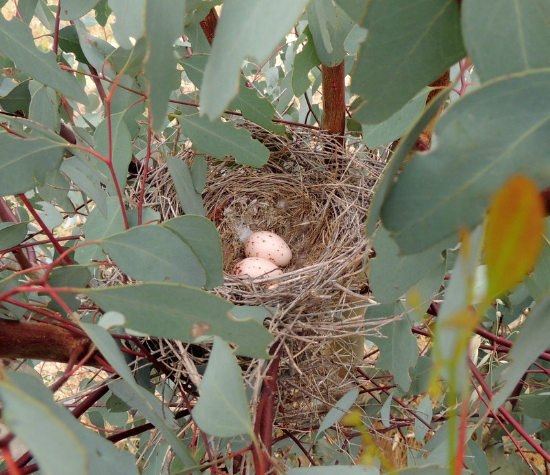 In my concerted quest to locate nests this season I was lucky enough to come across a nest in a two-metre high Red Gum (Eucalyptus camaldulensis) sapling. The nest contained two brown-spotted pink eggs (pictured left), with no adult in sight. A later viewing of the nest (from a distance) revealed mum (or dad) sitting on the eggs (pictured right).
