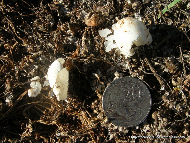 Once in a while when observing the natural world around us, we come across a mystery that we can’t readily solve from reference books – or a search engine for that matter. One such occurrence was the discovery of a hole near our apple tree the other morning. It was about 10cm deep, with sloping sides above a circular excavation with straight sides. It appeared to be a nest, presumably of a reptile, which had been exposed during the night, as it wasn’t visible the previous day and there was a pile of soil on one side, with four or five shattered eggs lying on the ground nearby.