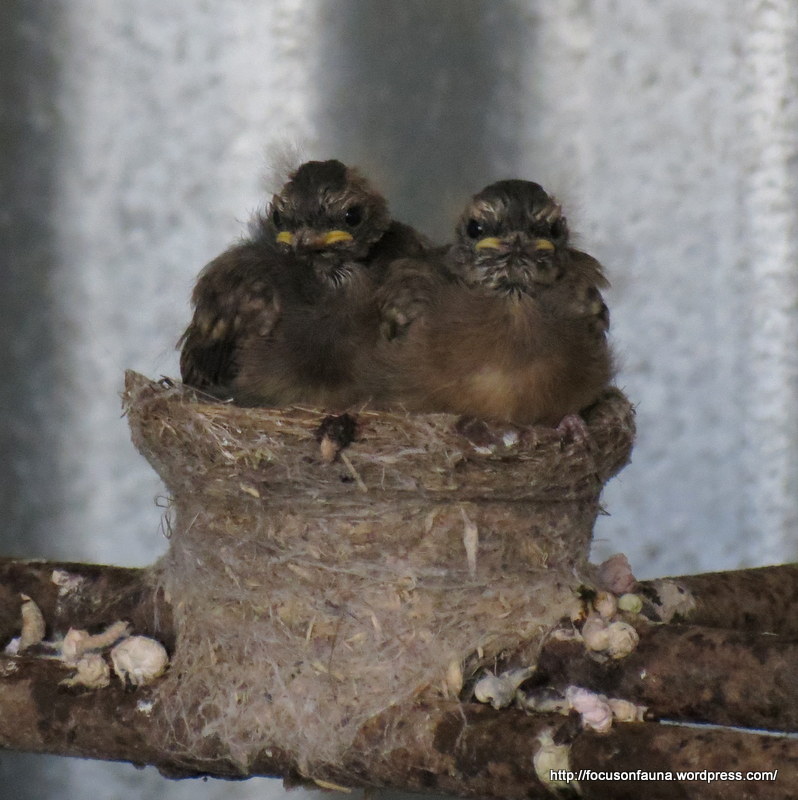 A previous post in November showed a Grey Fantail nest with a single egg. This nest was subsequently abandoned, we suspect due to either storm damage or the constant presence of a Grey Currawong. Not to be deterred, a week later the same pair of Grey Fantails started to build a nest in the corner of our large farm shed, on an old wool-pack frame. Interestingly, the nest did not have the usual ‘tail’ of a Grey Fantail’s nest, probably because it was built to span two parallel bars, rather than being built on and around a single thin branch. The normal nest is described as being like ‘a wine-glass without a base’.