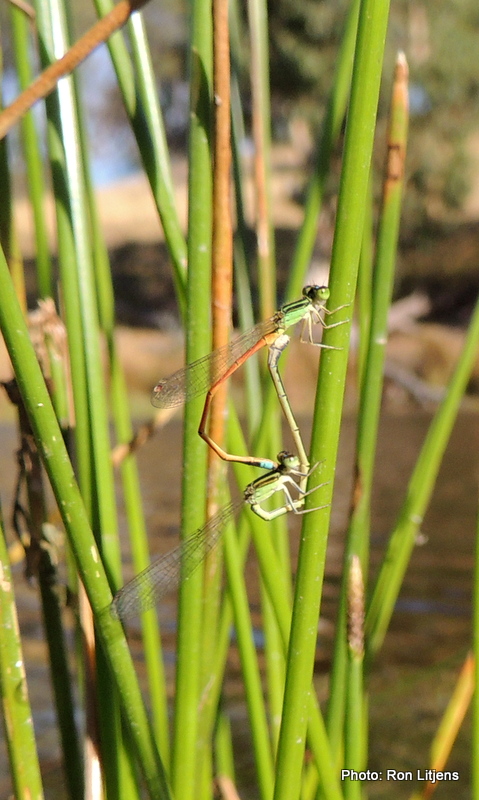 Damselflies and dragonflies make up the insect order Odonata. For anyone who has walked past a dam in summer the mating process is probably very familiar. Males patrol and aggressively defend a territory of water. After he attracts a mate, the male will grasp the female behind the head with claspers on the end of his abdomen. Pictured left are two Aurora Bluetails (Ischnura aurora) in that position.