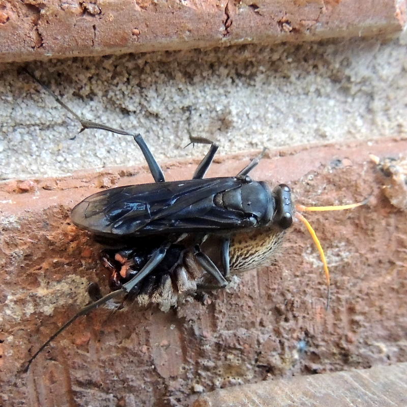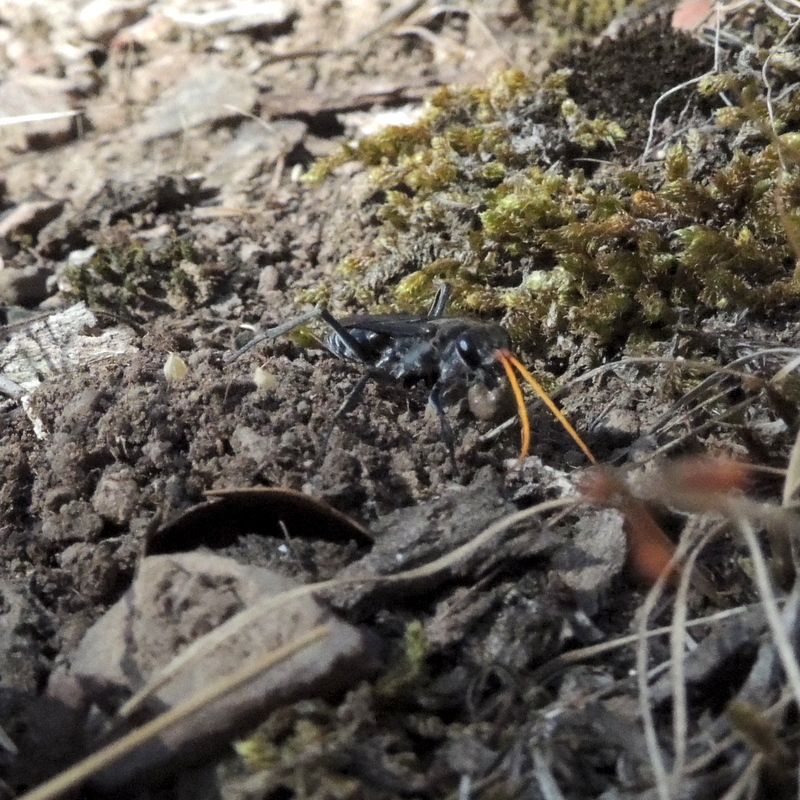 You may have noticed over the past couple of months a black wasp with bright orange antennae prowling around the place inspecting nooks and crannies. It is a Black Spider Wasp (Fabriogenia sp.) and as the name suggests it is looking for spiders.