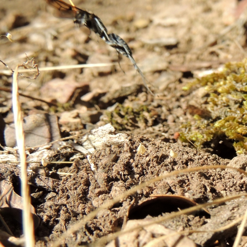 didn’t realise and only found out by watching this wasp is that once the spider has been deposited and the eggs laid the female wasp seals the spider and eggs into the burrow using wet mud, just as I have seen Potter Wasps or Mud-dauber Wasps do on the sides of our house. Pictured left is the female wasp returning to the burrow with jaws full of mud. Before entering the tunnel she would mould the mud into a convenient ball shape. And then it is off to source more mud (pictured below).