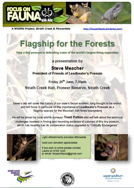 To highlight the plight of this little possum, we are holding a presentation titled “Flagship for the Forests” on Friday 26th June at Strath Creek Hall, starting at 7.30pm. The main speaker is Steve Meacher, President of Friends of Leadbeater’s Possum Inc. and Chair of Murrindindi Environment Advisory Committee. Steve will focus on the importance of Leadbeater’s Possum as a flagship species for the Mountain Ash forest ecosystem. He will be followed by local resident Trent Patten, a wildlife surveyor and relentless campaigner for protection of the possum, who will talk about the challenges involved and techniques used in recording evidence of colonies of Leadbeater’s.