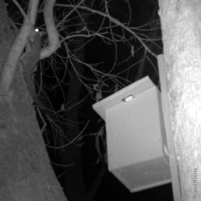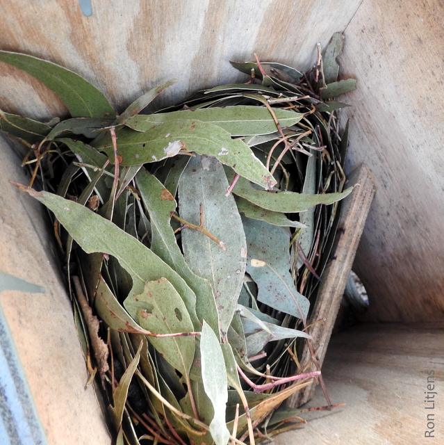 nest-box also has remained empty. But a quick inspection of the box last week showed evidence of recent activity, at last! – freshly rolled-up Long-leaved Box leaves (photo above). Rather than disturb the occupants we set up a motion-sensing camera on a nearby log to see who had taken up residence. The picture left shows a Sugar Glider just leaving the box. So now we have rosellas inspecting the sugar glider nest-box, sugar gliders in the phascogale nest-box and everything else (except rosellas) in the rosella nest-box. For all you nest-box builders out there, a label on the nest-box identifying what type of box would probably help potential residents identify their new homes correctly. Assuming they can read.