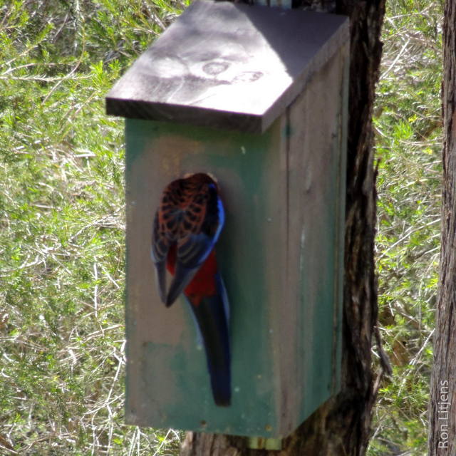 The Sugar Glider nest-box has not been occupied but has received attention from curious Crimson Rosellas (pictured left). The hole is too small to allow them to enter the box, but over the last three summers the rosellas have been gnawing away at the entrance, slowly making it bigger.