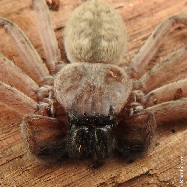 The cephalothorax has no antennae but has attached eight legs (see picture right). The knees of a huntsman instead of flexing vertically like most arthropods, flex forward. This allows the spider to be able to sidle into narrow spaces. The cephalothorax also houses eight simple eyes under which are two black chelicerae which contain the fangs. Huntsman poison is not regarded as fatal for humans.