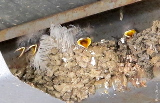 For more than a month Welcome Swallows (Hirundo neoxena), pictured left, have been building a nest under our deck. Hirundo is Latin for swallow and neoxena comes from the Greek words neos meaning new and xenos meaning visitor. Those who have encountered these birds before will know that welcome is a relative term. The construction and subsequent occupation of the nest usually results in an enormous splatter of faeces on the ground below the nest. But for the sake of being able to watch ‘close-up’ the development of young swallows in the nest it was worth the mess. The nest was built on a horizontal PVC pipe. Looking down through the deck we counted four eggs and the parents were ever attentive on the nest.