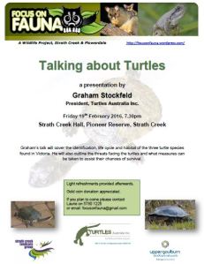 To learn all about the Eastern Snake-necked Turtle and other turtles, you are invited to attend a Focus on Fauna talk by Graham Stockfeld next Friday evening (19th February) starting at 7.30pm in the Strath Creek Hall. Click on the link to the flyer Talking about Turtles for full details, and we ask that you RSVP if you plan to come along.