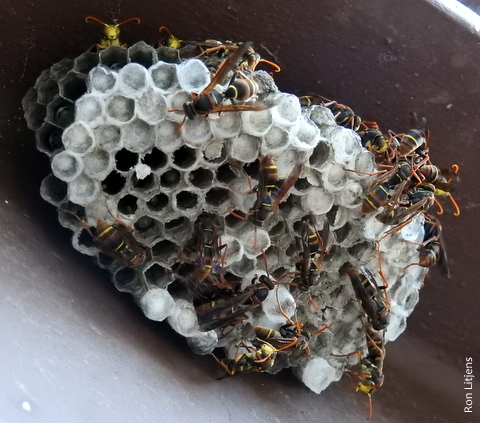 If you look carefully at the photo you can make out in the cells the eggs and the white form of the larvae. The capped pupal cells are also clearly visible. Somewhere in the mass of wasps is the queen who is indistinguishable in appearance from the worker wasps. The entire life-cycle is right there in one photo.