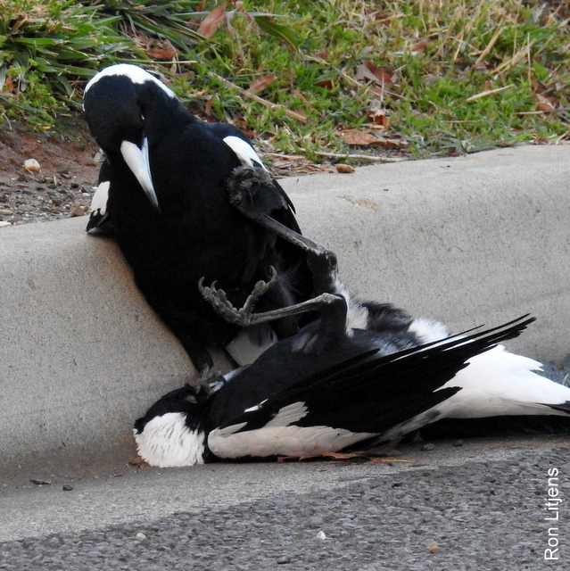 Dust ups between birds I am used to seeing (see Wattlebird Wars). They are usually over and done with in a flash. However in this case the dominant magpie in the fight held the other magpie down for several minutes occasionally delivering a peck or two to the prostrate victim which just laid there (pictured right). The carolling onlookers also added a peck or two for good measure.