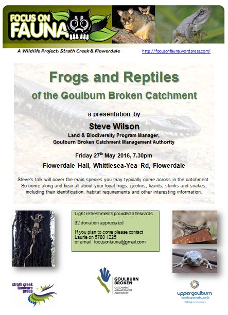 We think it’s a Plains Brown Tree Frog (Litoria paraewingi), but we’ll have a much better idea after Steve Wilson’s talk at the Flowerdale Hall on Friday evening. Steve will be talking about the frogs and reptiles of the Goulburn Broken Catchment. This is a natural follow-on from the previous Focus on Fauna talk on Turtles, and will complete the picture of our local reptiles and amphibians. Steve will have lots of wonderful photographs of the geckos, lizards, skinks, dragons and snakes, as well as frogs, that may be found in our district, some of which have featured in previous posts on this blog.