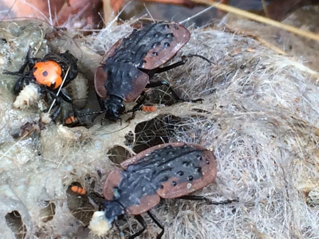 The beetle with the red head is known by the ominous name, Devil’s Coach Horse (Creophilus erythrocephalus) (from the Greek eruthros meaning red and kephale meaning head). It has large powerful jaws for cutting open prey. Unlike many beetles, its hard wing-casings only cover a small part of the abdomen. Active mainly at night the Devil’s Coach Horses are one of the first species to arrive at a dead animal (obviously after the flies have been there). The adult beetles feed on maggots and pupae of flies. The upper left photograph clearly shows a beetle with a maggot clenched firmly in its jaws. These beetles lay eggs in the carcass and the emerging larvae also voraciously predate on maggots.