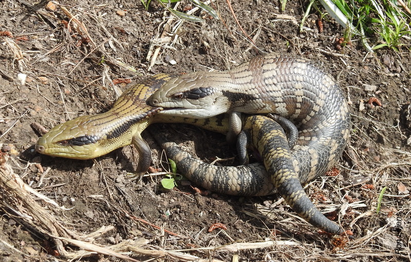 A cry of ‘snake in the garden’ from my ‘urban’ sister resulted in several people running to observe, instead of a snake, two Eastern Blue-tongue Lizards (Tiliqua scincoides) mating. Blue-tongue Lizards are the largest members of the Skink family. Eastern (otherwise known as Common or Northern) Blue-tongues are distinguished from their closely related cousins, the Southern Blue-tongues, in that they have striped rather than blotched markings. Eastern Blue-tongues mate between September and November and give birth to three to five live offspring between December and April.