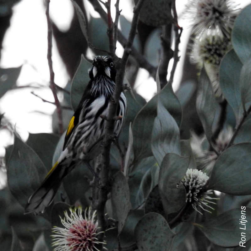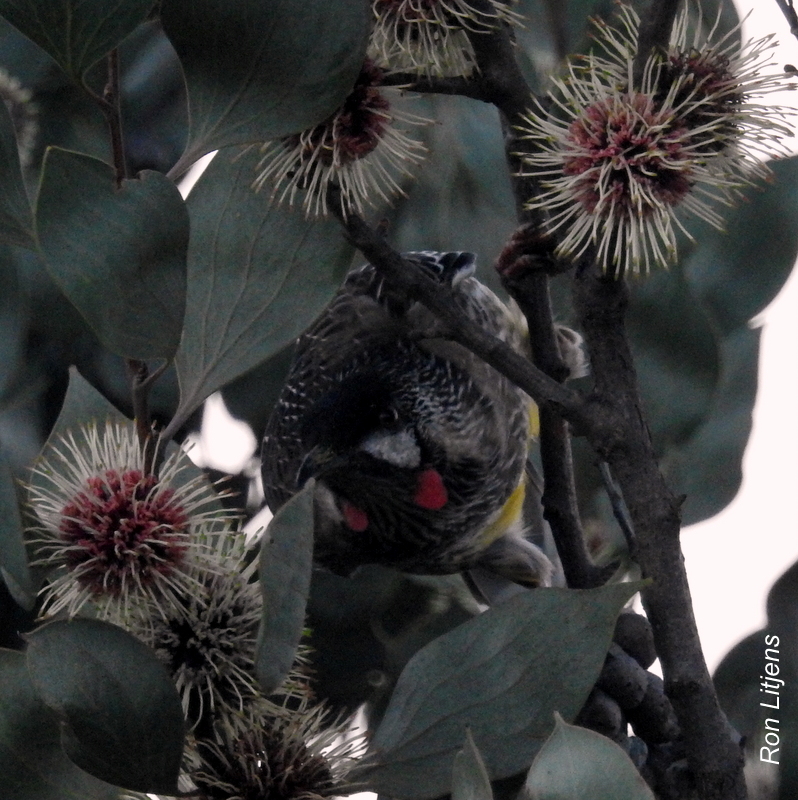 You don’t need to know where the trees are located to get an idea of where the birds are. The raucous territorial cries of the Red Wattlebird (Anthochaera carunculata), left, can be heard from a long way away. They are of course warning other wattlebirds that this is their feeding spot. And whilst the wattlebirds beat each other up, smaller honeyeaters like the New Holland Honeyeater (Phylidonyris novaehollandiae), right, and the Eastern Spinebill duck in and out of the trees to have their fill of nectar.